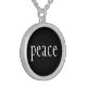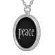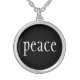 Necklace shown in silver plate with a black color background and text: Peace print.