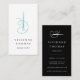 Elegant vertical business cards for seamstresses, fashion designers, stylists, tailors and more feature a sewing needle and thread in vibrant turquoise aqua with two lines of custom text beneath in crisp black. Customize the back with your full contact details in white lettering on a black background, beneath a matching sewing needle illustration.