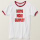 The product was as advertised. The message is succinct and is an eye-catcher. This shirt gets a heap of feedback from onlookers. Most ask you to stand still while they finish reading the definition. They then either give you the thumbs-up or nod any walk away. Either way, its a real conversation starter and so far, no one has disagreed enough with the print to verbalize. The material is fairly light, but the print is stable enough to withstand washes and some activity. A fair deal. Readable and durable.