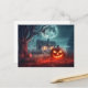 This eerie Halloween postcard showcases a glowing pumpkin set against a haunted house backdrop. You're welcome to tweak any of the options available and even add some text to the back of this postcard.