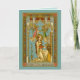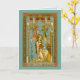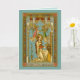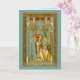 In this splendid NeoGothic Swiss devotional print, St. Cecilia of Rome (3rd century) is depicted playing an upright pipe organ. Her long auburn hair hangs loose and tumbles over her shoulders and down her back. She wears a medieval-style, cream-colored gown lined in green over a dark red-orange kirtle. The gown has a square neckline and bell sleeves. + On the print’s left is a potted lily plant. In the religious language of flowers, lilies signify purity. Despite her private vow of virginity, St. Cecilia was forced into an arranged marriage with a pagan named Valerian. The marriage was never consummated. The long and the short of it is that her new husband, having seen an apparition of the angel that guarded his wife’s virtue, converted to Christianity and respected her vow. + Against the aqua background patterned with gold dots and stars, two angels hover in the space above St. Cecilia. Clad in salmon pink, one angel holds an unfurled scroll; clad in green, the other angel plays a portative or hand-held organ. It is said that on her wedding day, St. Cecilia “sang in her heart to the Lord” instead of reveling; hence, her patronage of musicians (especially organists) and singers as represented by the two angels. + The entire scene is enclosed in a NeoGothic architectural framework and a border with colorful floral bosses. + Epilog: St. Cecilia, her husband St. Valerian, and her brother-in-law St. Tiburtius were all martyred. But, that’s a story for another day! + Feast: November 22 + Image Credit (BNG 02): Antique NeoGothic image of St. Cecilia, originally published in chromolithography by Benziger & Co., Einsiedeln, Switzerland, late 19th-early 20th century, from the designer’s private collection of religious ephemera.