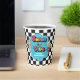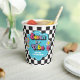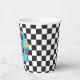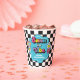 Neon 90's retro Seven is a vibe 7th birthday paper cups with hearts, daisies, disco ball and checker background.