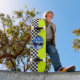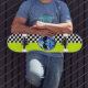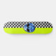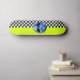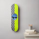 Neon Alien Checkered Skateboard Deck by BigTexFunkadelic, featuring a black and white checkered print split with a lime green background, and a blue paint splatter alien head on top.