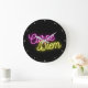Fun neon pink and yellow "carpe diem" word art design. Best on dark background. clock face