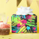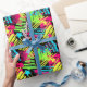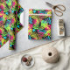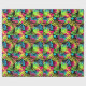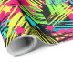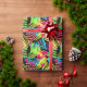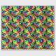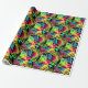 A fun Christmas wrapping paper feature bright blue, yellow, green and pink neon Christmas trees on a black background.