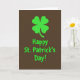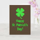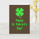 Designed with a deep chocolate-brown background, this St. Patrick’s Day card keeps the scene simple and modern while still feeling lively. At the top, a neatly balanced four-leaf clover sits centered, its bright green color drawing your eyes right away ☘️. Just below it, the words “Happy St. Patrick’s Day!” are stacked in a rounded sans-serif style, matching the clover’s green so the two elements feel like a close pair. The layout runs straight down the middle, giving the design a steady rhythm that reads like a friendly greeting offered face to face 💚. The limited colors make the green look extra bright against the dark backdrop, like a small spark in a cozy room. A soft glow around the clover and lettering adds a gentle halo effect, giving the flat design a touch of depth. The clover remains at the top center with the green text directly beneath it, both lightly outlined by that faint, soft-edged glow.