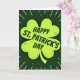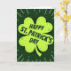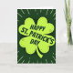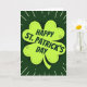 This card shows a large four-leaf clover in bright lime green centered on a deep forest-green background, setting a festive St. Patrick’s Day scene 💚. Inside the clover, fine dashed lines and tiny dots add a timeworn, tradition-leaning texture that feels like a quiet nod shared between close friends. A soft, dark shadow sits just beneath the clover, lifting it slightly from the background and giving the centerpiece a gentle, almost touchable depth. Across the middle of the clover, the text “HAPPY ST. PATRICK’S DAY” runs on a slight tilt in dark green, placed like a confident banner over the lucky symbol. The angled lettering and snug placement suggest an easy closeness, like a message meant for someone you’re happy to keep in your circle ☘️. Around the clover, thin white rays stretch outward with scattered white dots, like little sparks spreading from the center. The overall palette stays in layered greens with crisp white accents, and the radiating lines form a loose halo around the clover against the dark green field.
