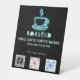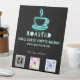 Stay connected with coffee / café customers using this tabletop pedestal sign that features a neon blue coffee cup with customizable text and social media qr codes on black background
