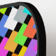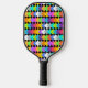 This pickleball paddle has a geometric design of neon diamonds overlapping each other on a field of black.
