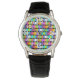 This men's watch has a geometric design of neon diamonds overlapping each other on a field of black.