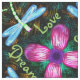 Neon Dragonfly is a repeating pattern of brightly glowing green dragonflies with iridescent turquoise wings flying around a glowing pink and purple flower. The dragonflies and flower stand out brightly against the primarily dark background of black with shimmers of light in orange-gold and green which gives the feeling of reflections on water at night. This is an original pattern hand drawn by Sue Chastain © 2015.