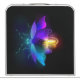 Antique, mechanical firefly with light bulb and thin wings glows orange, purple, turquoise on black background. Steampunk style.