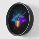Antique, mechanical firefly with light bulb and thin wings glows orange, purple, turquoise on black background. Steampunk style.