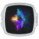Antique, mechanical firefly with light bulb and thin wings glows orange, purple, turquoise on black background. Steampunk style.