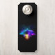 Antique, mechanical firefly with light bulb and thin wings glows orange, purple, turquoise on black background. Steampunk style.