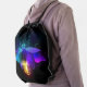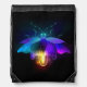 Antique, mechanical firefly with light bulb and thin wings glows orange, purple, turquoise on black background. Steampunk style.