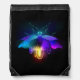 Antique, mechanical firefly with light bulb and thin wings glows orange, purple, turquoise on black background. Steampunk style.