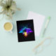 Antique, mechanical firefly with light bulb and thin wings glows orange, purple, turquoise on black background. Steampunk style.