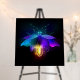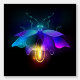 Antique, mechanical firefly with light bulb and thin wings glows orange, purple, turquoise on black background. Steampunk style.