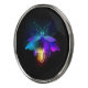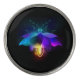 Antique, mechanical firefly with light bulb and thin wings glows orange, purple, turquoise on black background. Steampunk style.