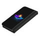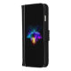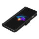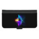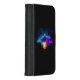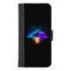 Antique, mechanical firefly with light bulb and thin wings glows orange, purple, turquoise on black background. Steampunk style.