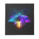 Antique, mechanical firefly with light bulb and thin wings glows orange, purple, turquoise on black background. Steampunk style.