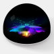 Antique, mechanical firefly with light bulb and thin wings glows orange, purple, turquoise on black background. Steampunk style.