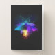 Antique, mechanical firefly with light bulb and thin wings glows orange, purple, turquoise on black background. Steampunk style.