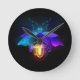 Antique, mechanical firefly with light bulb and thin wings glows orange, purple, turquoise on black background. Steampunk style.