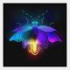 Antique, mechanical firefly with light bulb and thin wings glows orange, purple, turquoise on black background. Steampunk style.