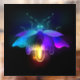 Antique, mechanical firefly with light bulb and thin wings glows orange, purple, turquoise on black background. Steampunk style.