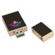 Antique, mechanical firefly with light bulb and thin wings glows orange, purple, turquoise on black background. Steampunk style.