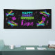 A pattern of scattered glow sticks and bracelets in an array of bright neon colors adds a fun element to this Sweet Sixteen banner design. Add a personalized name using the provided template. Search ID760 to see coordinating invitation and other party supplies with this colorful design.