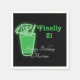 A drink at your 21st birthday party; Neon green umbrella drink with green text that says Finally 21 and birthday text with your name.