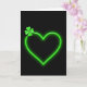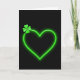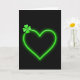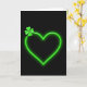This card features a neon-green heart outline glowing at the center of a deep black background, with a soft halo that makes the light look gently diffused. Resting on the upper-left curve of the heart is a four-leaf clover in a slightly lighter, more natural green, like a small lucky touch leaning in close. The strong contrast between the green glow and the black space keeps your eyes on the heart, as if it’s the only light in the room. There’s no character scene, but the clover’s placement feels like a quiet gesture of friendship or romance—something small, steady, and close to the heart 💚. Any greeting text can sit beneath the heart in matching neon green, centered and spaced so it doesn’t compete with the main shape. A short line could also be tucked near the lower-right curve in a softer green for a subtle second note ☘️. The heart’s outline stays smooth and evenly thick, with the clover perched neatly on the top-left edge against the solid black field.