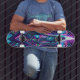 "Ride the rhythm of the future with the 'Neon Groove: Cyber DJ Skateboard Deck'. This deck showcases a sleek android DJ, aglow with neon circuitry, spinning tracks on a high-tech turntable. Set in a pulsating futuristic club bathed in laser lights and holographic displays, the scene is alive with the energy of cyber-enhanced club-goers. The vibrant neon purples, electric blues, and greens capture the electrifying atmosphere of the club.