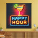 Bright neon lights display the message "Happy Hour" and cocktail graphic on a brick wall background