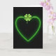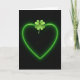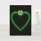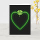 This card features a deep black background with a glowing neon-green heart outline that feels like it’s lit from within 💚. The heart’s smooth, unbroken line draws your eye inward, like an invitation to step closer and linger. Resting at the very top point of the heart is a four-leaf clover ☘️, its soft texture and natural edges standing out against the sleek glow below. The clover’s leaves show slight shifts in green and gentle shading, giving it a real, picked-from-the-grass look. There’s no character scene, but the pairing of the clover and heart reads like a quiet promise between close friends or sweethearts, held in a shared glance you can almost imagine. Any text would sit best in small lettering near the bottom in matching green, leaving the center open so the symbols do the talking. The brightest highlight stays along the heart’s outline, while the clover sits crisp and centered at the top, framed by the surrounding black space.