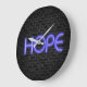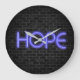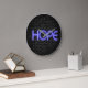 Glowing purple blue neon hope marquee sign on urban brick wall.