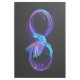 Glowing, purple infinity symbol with flying, luminous, blue hummingbird on black background. Neon.