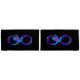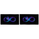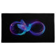 Glowing, purple infinity symbol with flying, luminous, blue hummingbird on black background. Neon.