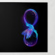 Glowing, purple infinity symbol with flying, luminous, blue hummingbird on black background. Neon.