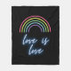 Comfy fleece blanket with timely message : Love is love - advocating for love regardless of adversity, orientation or identity - in neon script text with colorful neon rainbow. Best on dark background.