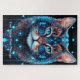This mesmerizing jigsaw puzzle features a majestic black cat illuminated with glowing neon mandala patterns. The intricate, symmetrical designs flow across its fur in vibrant hues of electric blue, fiery orange, and magenta. The cat's piercing turquoise eyes seem to glow with mystic energy, drawing you into its enigmatic gaze. Set against a deep black background, the vivid lines and radiant details create a dazzling contrast, making each puzzle piece a work of art. A stunning blend of fantasy and elegance, perfect for those who love cats, color, and cosmic mystery.