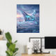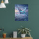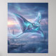 A graceful neon manta ray glides through a surreal sky ocean above the clouds, formed from translucent wing membranes, smooth metallic surfaces, and glowing aerodynamic circuits. Cyan, electric blue, violet, and silver light flows across its wide fins, creating calm movement and dreamlike beauty. Floating platforms, distant towers, luminous vapor currents, layered clouds, and sunset haze add endless depth. This elegant futuristic marine design is perfect for serene interiors, offices, bedrooms, and anyone who loves peaceful sci-fi nature themes.