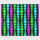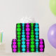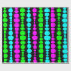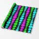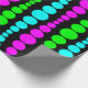 This wrapping paper has a mid-century modern design of neon pink, green, and blue rounded rectangles in increasing and decreasing size running vertically on a field of black.