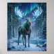 A towering neon moose stands proudly in a futuristic boreal grid forest, crafted from armored fur textures, glowing body lines, and radiant antlers branching like energy networks. Cyan, emerald, silver, and electric blue tones illuminate its massive frame. Digital pine trees, snow-dusted ground, misty air, reflective ice, distant mountains, and northern lights create an epic wilderness atmosphere. This bold woodland design blends strength, nature, and cyber style, ideal for cabins, offices, gaming rooms, and moose lovers.