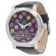 Neon pink, yellow and purple on black pickleball pattern, custom text Watch. Perfect as a gift for pickleball player. Customizable text on both sides