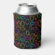 This can cooler has a geometric design of groups of three ovals in neon colors scattered about on a field of black.