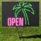 Neon pink "Open" text with neon green tropical palm tree silhouette on black background makes this a great design for personal and a variety of retail stores and businesses